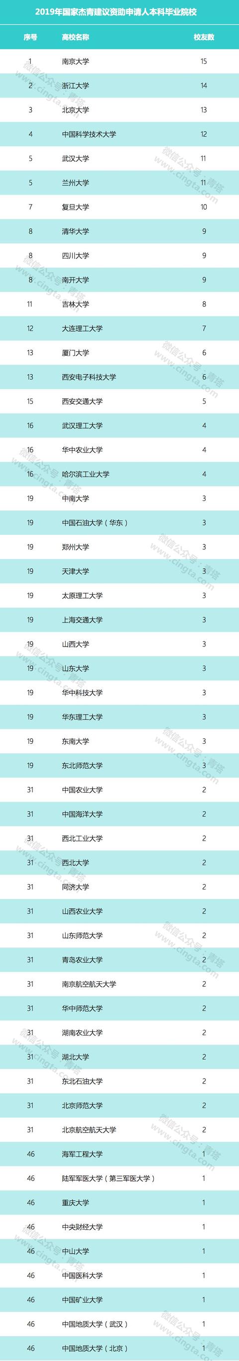 除了各類名校外,還有部分地方重點(diǎn)高校也有不錯(cuò)表現(xiàn)。例如山西大學(xué)、山西農(nóng)業(yè)大學(xué)、山東師范大學(xué)、青島農(nóng)業(yè)大學(xué)、湖南農(nóng)業(yè)大學(xué)、湖北大學(xué),今年杰青中有多位是它們的校友。