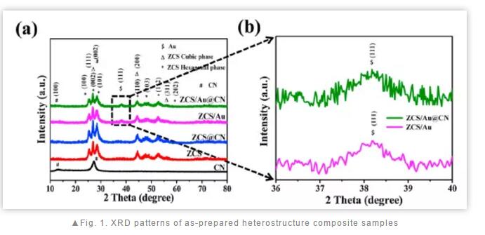 如圖1中的XRD譜圖所示,CN有兩個(gè)明顯的衍射峰,在2θ = 27.6°時(shí)峰值與g-C3N4在(002)衍射面層間的堆積有關(guān),在2θ = 12.7°處(100)面的衍射峰則是由于在平面內(nèi)的tri-s-triazine的重復(fù)單元。共軛芳香族體系的(002)衍射峰比之前報(bào)道的g-C3N4的衍射峰要強(qiáng),這表明,巴比妥酸的加入大大提高了制備的CN的結(jié)晶度,結(jié)晶度的增加可以加速電子在晶面的轉(zhuǎn)移,提高光催化活性。ZCS固溶體樣品的衍射圖形為典型的六邊形和立方結(jié)構(gòu),在(100),(002),(101),(110),(103),(112),(202)面上具有顯著的峰,而(111)、(200)、(311)面與ZCS立方相匹配。此外,所制備的ZCS納米球的衍射峰明顯而尖銳,表現(xiàn)出異常的結(jié)晶性質(zhì)。沒(méi)有額外雜質(zhì),表明制備樣品的相純度高。ZCS/Au和ZCS/Au@CN復(fù)合材料的衍射峰與純ZCS和CN的衍射峰相似。結(jié)果表明,在AuNPs光沉積過(guò)程中,ZCS或CN的相結(jié)構(gòu)沒(méi)有發(fā)生變化。在ZCS/Au@CN樣品中,CN的衍射強(qiáng)度相對(duì)較低,原因是其在復(fù)合材料中的含量較低(5% wt%)。通過(guò)進(jìn)一步的HRTEM、XPS分析和UV-Vis中的波段漂移,可以發(fā)現(xiàn)制備樣品中AuNPs和CN的清晰存在(圖2)。