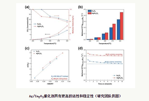 基于理論計算的結(jié)果,研究人員采用沉積沉淀法制備出Ag/In2O3催化劑,并與氧化銦催化劑對比進行了反應(yīng)活性評價。對比結(jié)果顯示,銀的加入提升了二氧化碳加氫生成甲醇的能力,明顯降低了其轉(zhuǎn)化的表觀活化能。而穩(wěn)定測試的結(jié)果也說明Ag/In2O3催化劑具備更好的催化穩(wěn)定性,相比In2O3催化劑,反應(yīng)10小時后,活性保持率為90.5%,而In2O3催化劑的活性保持率僅為80.4%。