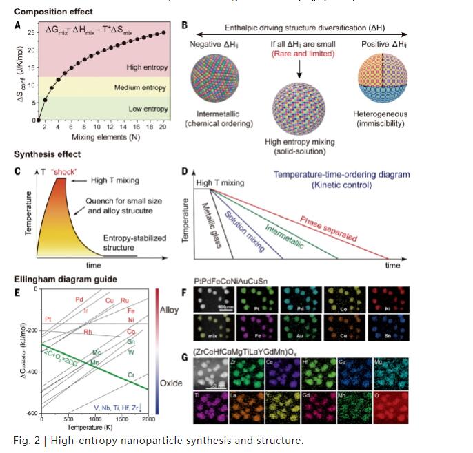 從熱力學的角度來看,高熵納米顆粒的形成是焓和熵競爭的結果(ΔG=ΔH-T?ΔS)。高熵納米顆粒的構型熵隨著元素數(shù)量的增加而增加,并作為單相混合的驅動力(圖2A)。多元素相互作用的焓(ΔHij)在很大程度上取決于組成元素的性質,這直接影響近平衡條件下的所得相(圖2B)。具有廣泛組成范圍和多元素數(shù)(多達8個)的高熵合金 (HEA) 納米粒子的合成是通過由馬里蘭大學胡良兵教授發(fā)明的高溫“熱沖擊”工藝實現(xiàn)的(圖2C)。這種合成方法的冷卻速率是一個重要參數(shù),因為它影響組成元素可以實現(xiàn)的非平衡程度和結構有序性(圖2D)。通過說明組成元素的氧化電位隨溫度的變化,Ellingham 圖可用于指導高熵納米粒子的熱化學合成(圖2E)。一般而言,靠近Ellingham圖頂部的元素,如貴金屬和Fe、Co、Cu,氧化電位較?。锤菀妆贿€原),可以通過高溫合成形成合金納米顆粒,如八元 PtPdFeCoNiAuCuSn 的 HEA 納米顆粒(圖2F)。相比之下,靠近圖表底部的元素,如 Zr、Ti、Hf 和 Nb,具有較大的氧化電位,可以形成高熵氧化物納米顆粒,如 (ZrCeHfCaMgTiLaYGdMn)Ox(圖2G)。