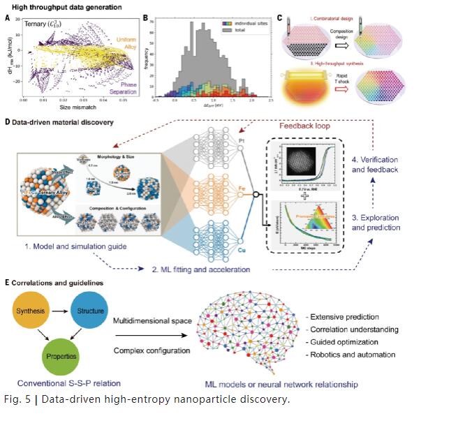 近年來,高熵納米顆粒已成為一個快速發(fā)展的研究領域。由于它們的多元素組成和獨特的高熵混合狀態(tài)可以帶來活性可調和穩(wěn)定性增強,這些納米顆粒在催化劑設計和探索方面受到了廣泛關注。然而,這種巨大的潛力也伴隨著很大的挑戰(zhàn),它們巨大的組成空間和復雜的原子結構阻礙了對其全面探索和基本理解。通過合成、表征、催化應用、高通量篩選和數(shù)據(jù)驅動材料發(fā)現(xiàn)的多學科視角,本綜述致力于討論高熵納米顆粒的重要進展,并揭示其未來在催化,能源和可持續(xù)性應用方面發(fā)展的關鍵需求。