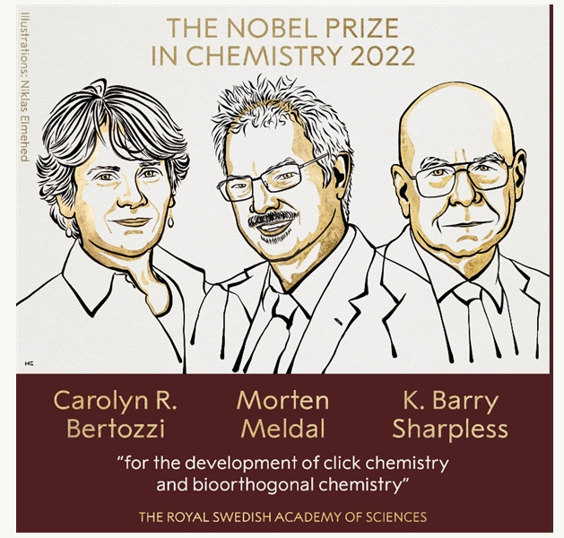 北京時間10月5日下午5點47分許,瑞典皇家科學院決定將2022年的諾貝爾化學獎授予美國科學家Carolyn R. Bertozzi、丹麥科學家Morten Meldal和美國科學家K. Barry Sharpless,以表彰他們“在點擊化學和生物正交化學方面的發(fā)展”。