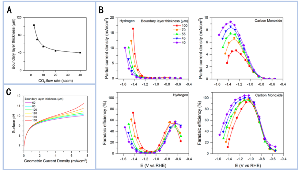 圖1.(A)多晶金上不同CO2流速下鐵氰化物還原的邊界層厚度;(B)多晶銀上活性與邊界層厚度的關(guān)系;(C) 0.1 M重碳酸鹽電解液中,不同邊界層厚度下表面pH和幾何電流密度的關(guān)系.