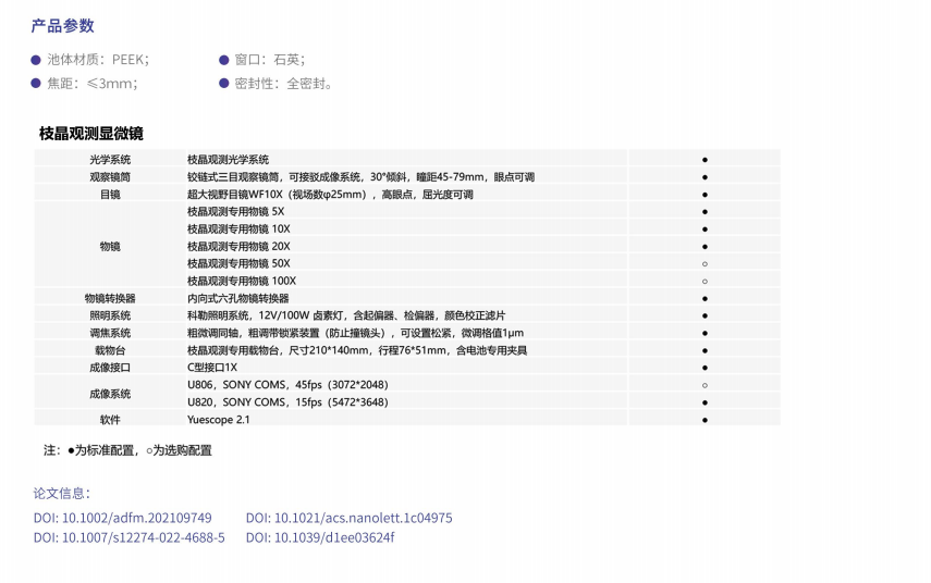 枝晶觀測專用托架 標(biāo)配適合枝晶觀測的專用載物臺,以及多款不同功能的專用夾具,能夠適用各種不同規(guī)格電解池。 產(chǎn)品介紹 反應(yīng)池可用于全方位觀測金屬負極在充放電過程中的枝晶生長/溶解過程,滿足不同金屬負極(鋰、鈉、鋅等)的觀測需求,設(shè)計簡單,密封性好,掾作方便,可重復(fù)性使用。