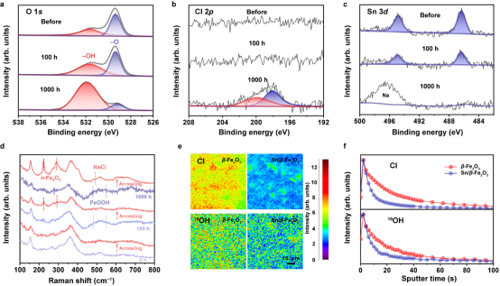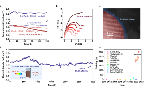論文中提出了晶格中的Sn增強(qiáng)金屬-氧相互作用的原理,Sn的存在顯著增強(qiáng)了M-O鍵的強(qiáng)度,防止反應(yīng)中間體局部高濃度的質(zhì)子對晶格的攻擊,提高了晶體結(jié)構(gòu)的穩(wěn)定性。制備的Sn/β-Fe2O3光陽極在長時(shí)間反應(yīng)后僅在淺層表面檢測到重構(gòu)的發(fā)生和Cl?的吸附。在模擬海水電解液中工作3000小時(shí)后,光電流仍然保持在初始值的96.8%,是目前世界上穩(wěn)定性最高的光陽極材料。此外,該工作對材料在海水中腐蝕機(jī)理的探究,以及在防腐蝕領(lǐng)域的探索也具有重要意義。