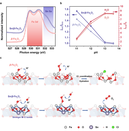 近日,南京大學(xué)現(xiàn)代工學(xué)院李朝升、鄒志剛團(tuán)隊(duì)探索了光電化學(xué)分解海水過程中OH?和Cl?等離子參與β-Fe2O3表面重構(gòu)的過程,并且利用晶格中的Sn增強(qiáng)金屬-氧相互作用的原理,抑制了過度的表面重構(gòu),在模擬海水電解液中穩(wěn)定工作3000小時(shí),獲得了目前報(bào)道的穩(wěn)定性最好的海水分解光陽極材料。相關(guān)的工作以“Long-term durability of metastable β-Fe2O3 photoanodes in highly corrosive seawater”為題發(fā)表在Nature Communications上。